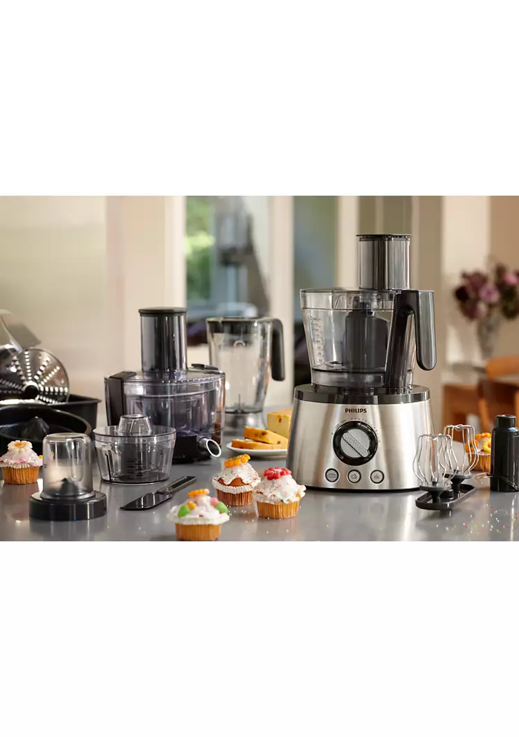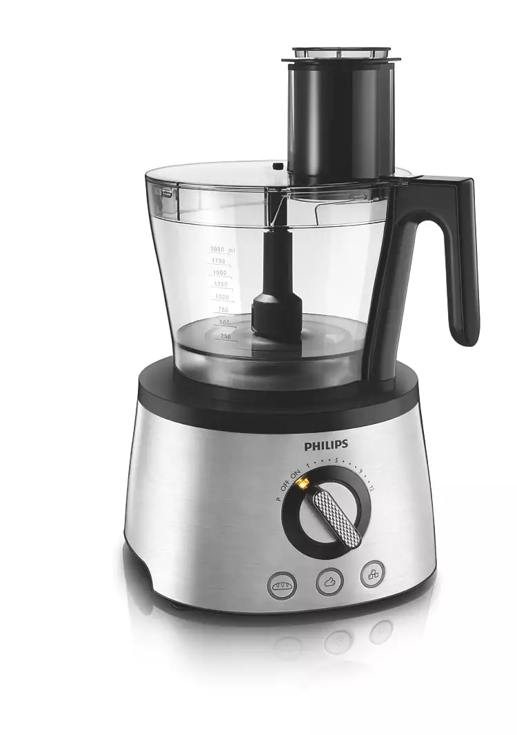 غذاساز «فیلیپس» (Philips) مدل «HR7778» دستگاهی باکیفیت و پرکاربرد است. با این دستگاه میتوانید در خانه نان و کیک بپزید، انواع موادغذایی را خرد یا رنده کرده و انواع نوشیدنیها را تهیه کنید. بدنهی این دستگاه از استیل ضدزنگ ساخته شده است که عمر طولانی دستگاه را تضمین میکند. با کمک دکمهی چرخشی روی دستگاه میتوان سرعت چرخش موتور را تا 12 درجه تغییر داد و در مواجهه با مواد سخت و سفت، با چرخاندن دکمه روی حالت پالس، از حداکثر توان موتور برای چند لحظه استفاده کرد. این دکمهی چرخشی، روکش کرومی دارد و سطح آن طوری طراحی شده است که هنگام کار از دست لیز نمیخورد. دکمههایی برای درستکردن خمیر، کرم و تهیهی نوشیدنی با یخ بهصورت پیشفرض طراحی شدهاند و در صورت فشردن هرکدام از این دکمهها، دستگاه بهصورت خودکار نوع عملکرد انتخابشده را با سرعت مناسب آن عملکرد برای رسیدن به بهترین نتیجه تنظیم میکند.